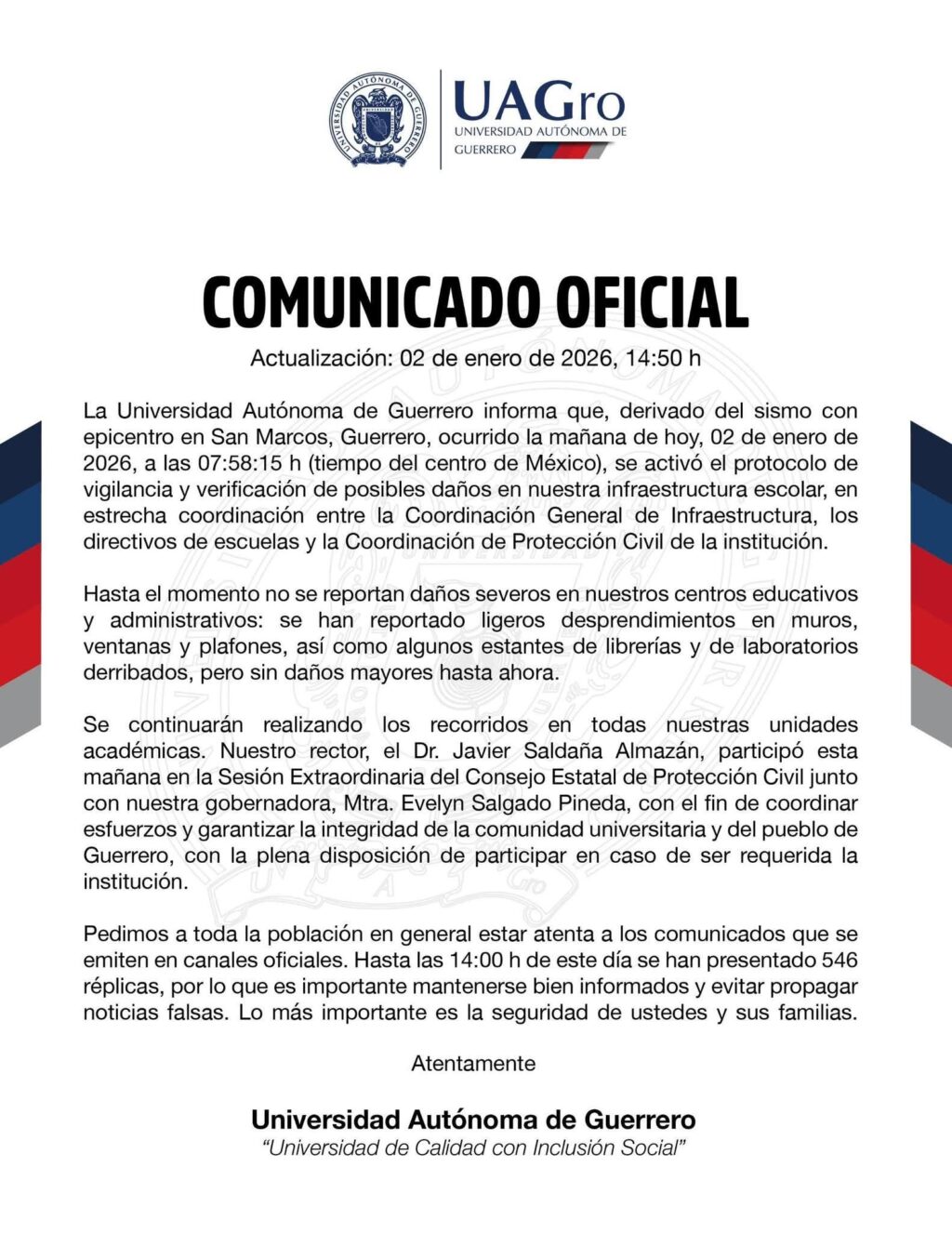 Chilpancingo, Gro., 2 de enero de 2026.- En mensaje dirigido a la comunidad universitaria, el rector de la Universidad Autónoma de Guerrero (UAGro), Dr. Javier Saldaña Almazán, recomendo a los universitarios mantenerse atentos a los comunicados oficiales que emitan el Gobierno Federal, Estatal y Municipal tras el sismo de 6.5 de magnitud con epicentro en el municipio de San Marcos, Guerrero.
